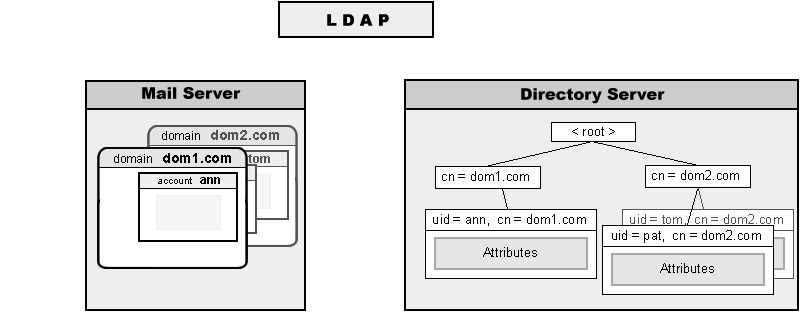 Наконец, CommuniGate Pro может работать с обычными (не хранимыми в справочнике) Доменами, но использовать при этом управление Пользователями через LDAP; при этом работа происходит так же, как и при использовании Доменов в Справочнике: Пользователи создаются и изменяются при помощи команд LDAP. Эта возможность называется Управление Пользователями через LDAP.